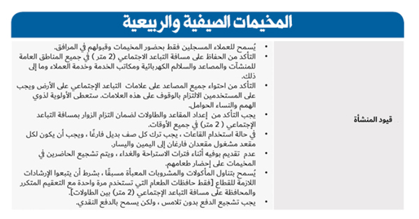 ونص البروتوكول كذلك، على إعادة افتتاح المخيمات الصيفية والربيعية وتشمل جميع المخيمات الصيفية التي تعمل في جميع المرافق بما في ذلك مراكز الأطفال والمدارس والفنادق والنوادي الرياضية والجمنازيوم والمكتبات ومراكز الفنون فيما تم استثناء الحضانات من اعادة افتتاح المخيمات.