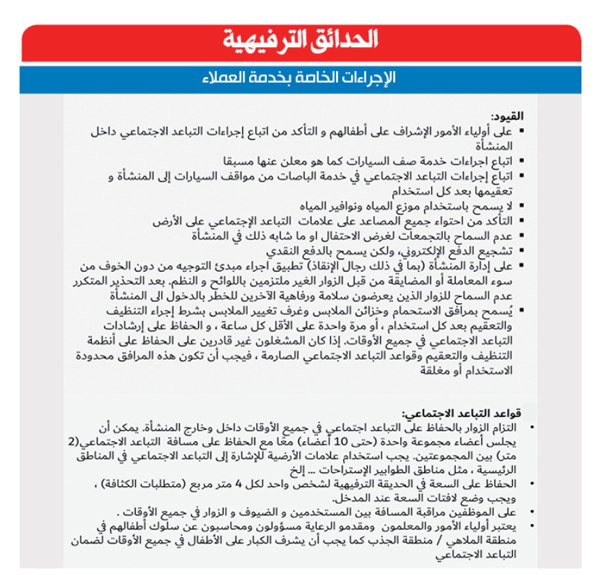 وشمل البروتوكول إعادة افتتاح الحدائق الترفيهية المغطاة على غرار عالم المغامرات آي أم جي مع استثناء الأنشطة التي تتطلب المقابلة وجها لوجه والأنشطة والترفيه الحي والحفلات والمواكب والتجمعات الإجتماعية.