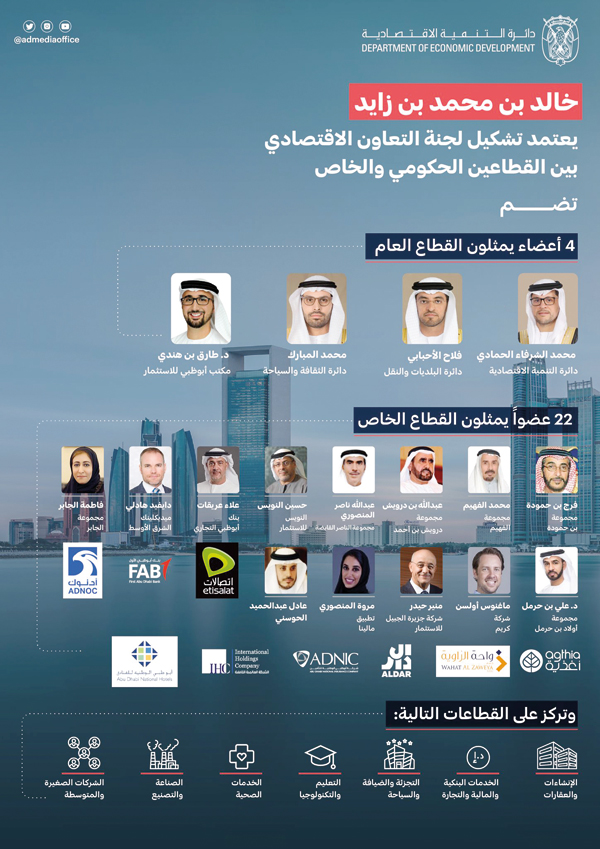 ووجه سمو الشيخ خالد بن محمد بضرورة تعزيز دور القطاع الخاص وإشراكه في خطط التنمية الاقتصادية المستدامة لإمارة أبوظبي، واعتمد تشكيل لجنة الشراكة/ التعاون الاقتصادي بين القطاعين الحكومي والخاص، ووجه بسرعة تقديم المقترحات لتعزيز تطوير القطاع الخاص وتطوير القطاعات الرئيسية المحددة في استراتيجية الإمارة.