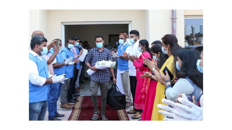 واحتفل قائد عام شرطة عجمان مع الحضور، بخروج العامل ومغادرته المبنى المخصص لعزل العمال في منطقة الصناعية بعجمان، وتسلم العامل المتعافي بطاقة التهنئة وباقة الورد والحلوى، وسط أجواء من الفرحة الغامرة بحضور ضباط وأفراد من شرطة عجمان، والطاقم الطبي والأطباء والممرضين ومتطوعي مركز «KMCC»، الذي اعتنى بالمصابين من كيرلا في الدولة.
