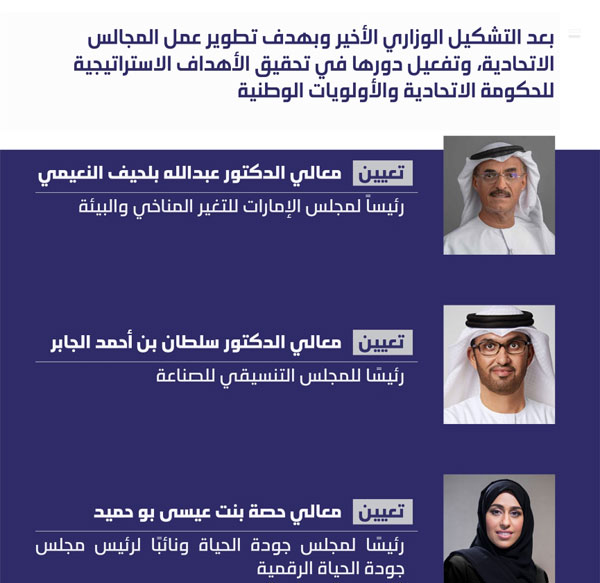 تأتي التعيينات الجديدة في أعقاب التشكيل الوزاري الأخير لحكومة الإمارات، وبهدف تطوير عمل المجالس الاتحادية، وتفعيل دورها في تحقيق الأهداف الاستراتيجية للحكومة الاتحادية والأولويات الوطنية.