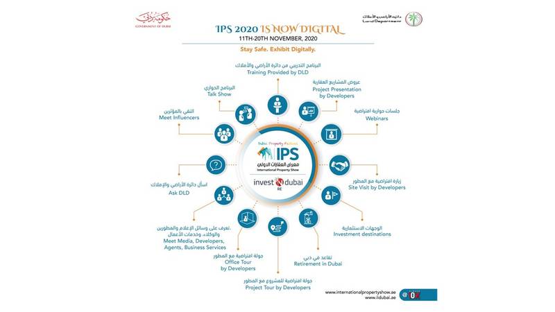 أعلنت دائرة الأراضي والأملاك في دبي عن انطلاق النسخة الافتراضية الأولى من معرض العقارات الدولي خلال الفترة من 11 - 20 نوفمبر/ تشرين الثاني 2020، ليكون أكبر منصة لبيع وشراء العقارات في الشرق الأوسط لسوق العقارات المحلي والأسواق الدولية، وذلك بالشراكة مع مبادرة «استثمر في عقارات دبي».