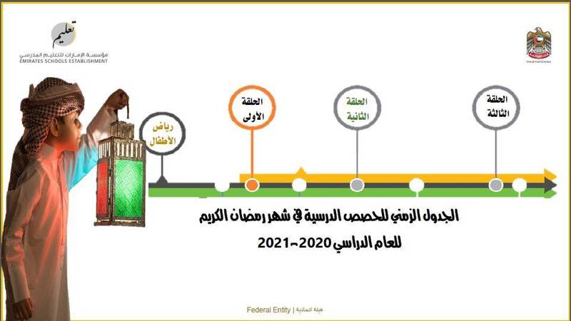 اعتمدت مؤسسة الإمارات للتعليم المدرسي (تعليم) الجدول الزمني للحصص الدراسية لطلبة جميع مراحل التعليم «رياض الأطفال والحلقات الأولى والثانية والثانوية»، خلال شهر رمضان الكريم للعام الدراسي 2020-2021؛ حيث تم تقليص ساعات الدوام، ليبلغ عدد ساعات الدراسة لطلبة الحلقتين الثانية والثالثة 4 ساعات تقريباً يومياً شاملة الاستراحة والفواصل الزمنية بين الحصص، مقابل 3 ساعات لطلبة الحلقة الأولى، إلى جانب ساعتين لرياض الأطفال.