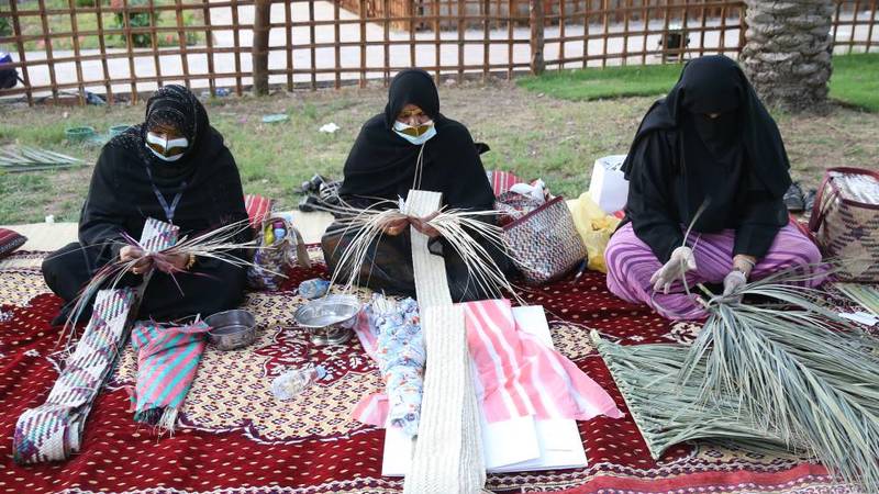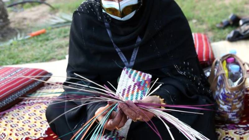 من الفجيرة جاءت عائشة عبيد سالم الكعبي إلى قلب الشارقة، حيث تتواصل أيامها التراثية، حاملة معداتها وخبرتها الطويلة في هذه الحرفة التي لاتزال تمارسها إلى يومنا هذا، فتجدل الخوص بطريقة تشبه الضفائر المتلاصقة التي عملت على تصميمها على شكل شرائط طويلة جداً، تجمعها فيما بعد مع بعضها لتشكل منها حصيراً كبير الحجم.