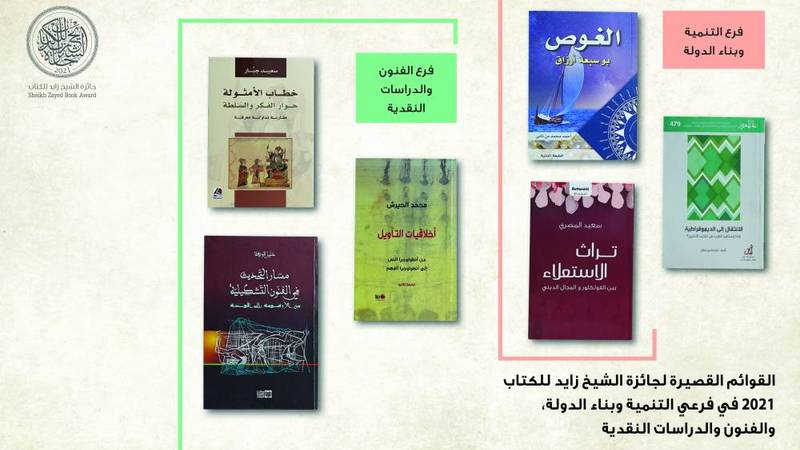 أعلنت جائزة الشيخ زايد للكتاب في مركز أبوظبي للغة العربية التابع لدائرة الثقافة والسياحة – أبوظبي، عن الأعمال التي ضمتها القوائم القصيرة في فروع «التنمية وبناء الدولة» و«الفنون والدراسات النقدية» في دورتها الخامسة عشرة؛ حيث اشتملت القوائم على ستة أعمال من مصر والمغرب والإمارات وتونس.