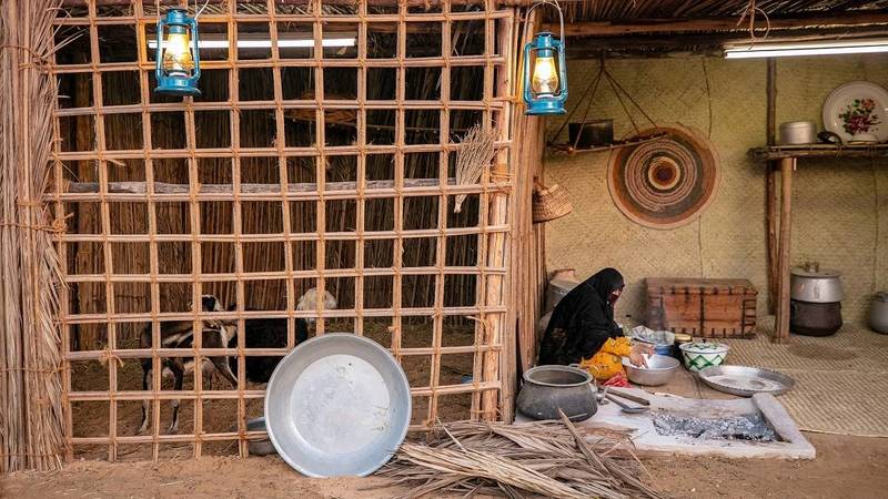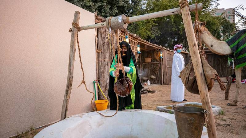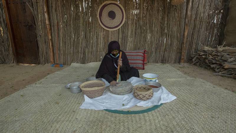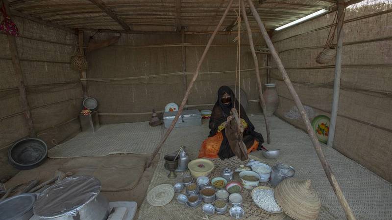 فعلى يمين المدخل الذي يقود الزائر إلى نبض مجتمع البداوة الأصيلة، يقف راعي الإبل إلى جانب ناقته، يتأمل الوجوه بفراسته المتوارثة. ولا ضجيج في مضارب البادية، لأن في الصمت حكمة، ولأن القهوة تنتظر على نار هادئة، بالقرب من البساط المغزول من شعر الماعز. ومن تلك الخيوط أيضاً يغزل «الزريول» الذي يلبس في القدم لاتقاء حرارة الرمال، ويصنع الخزام الذي يوضع على الرأس مثل العقال لتثبيت الغترة.