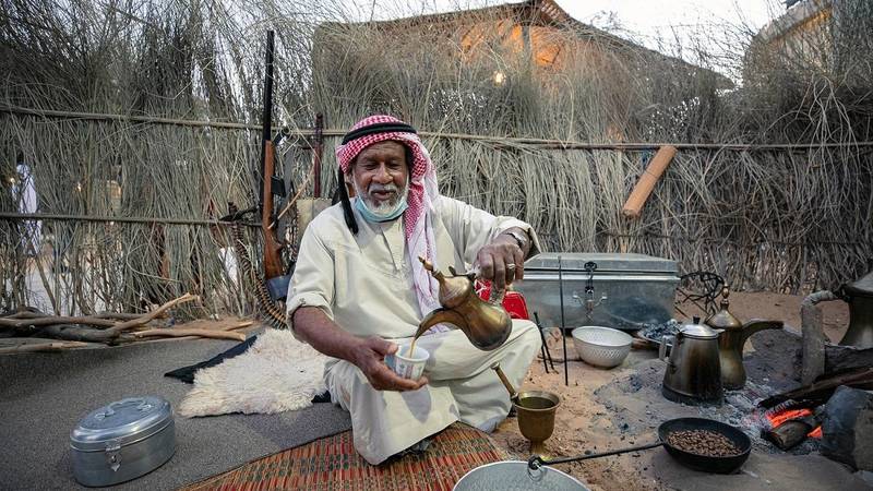 يركز الزوار عدساتهم على بدوي يحمّص حبات القهوة.. يحركها كما لو أنه يحصي عدد حباتها السمراء الداكنة، وكلما تهيأت وأصبحت جاهزة لسحقها مع حبات الهيل، تتزايد عدسات الكاميرات المسلطة على ركن القهوة، حينها تفوح رائحة الضيافة العربية بكامل أصولها وطقوسها.