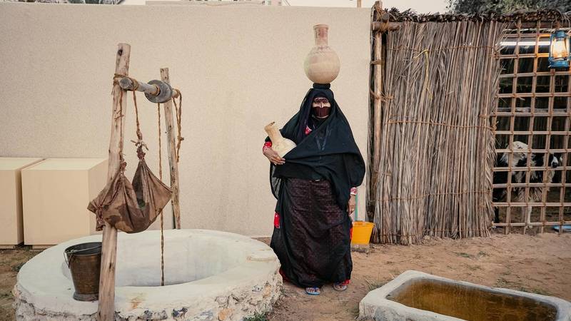 اعتمد تصميم جناح البيئة البدوية على المحاكاة الواقعية، فهناك الأرضية الرملية التي تخلق انطباعاً يساعد على تخيل طبوغرافيا البادية، فيصبح الوقوف على حافة البئر المحاطة بالرمال رسالة واضحة، تنبه الزائر إلى القيمة التي تمثلها كل قطرة ماء للإنسان والحيوان والنبات، ولا تُشد الرحال في البيئة البدوية إلا إذا جف المرعى وشحت المياه، أو ارتحل الأهل والأحبة ولا بد من اللحاق بركبهم.