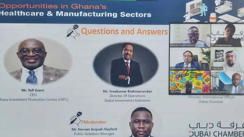 نظمت غرفة تجارة وصناعة دبي، مؤخراً، ممثلة في مكتبها التمثيلي في العاصمة الغانية أكرا، وبالتعاون مع مركز الترويج الاستثماري في غانا، وشركة دبي للاستثمار، فعالية افتراضية حضرها 236 مشاركاً للتعريف بالفرص الاستثمارية في قطاعي الرعاية الصحية والتصنيع في غانا.