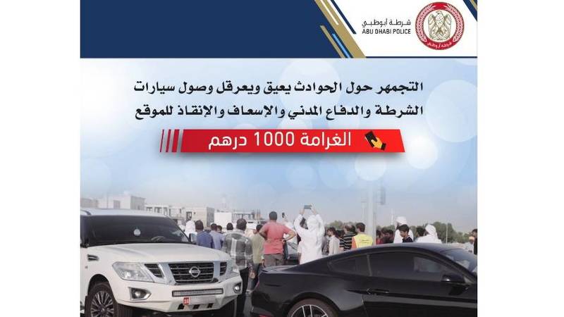 وأكدت على التطبيق الحازم للبند رقم 74 من قانون السير والمرور الاتحادي والذي ينص على "عرقلة حركة السير (التجمهر) أثناء الحوادث" غرامة قدرها 1000 درهم.