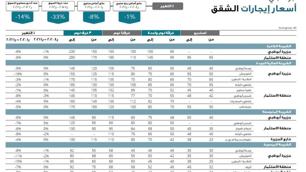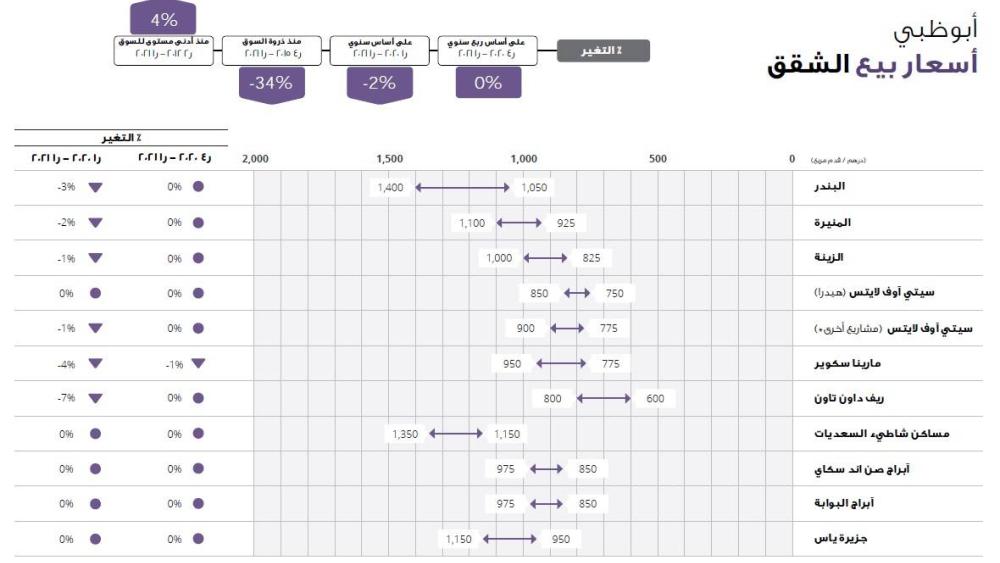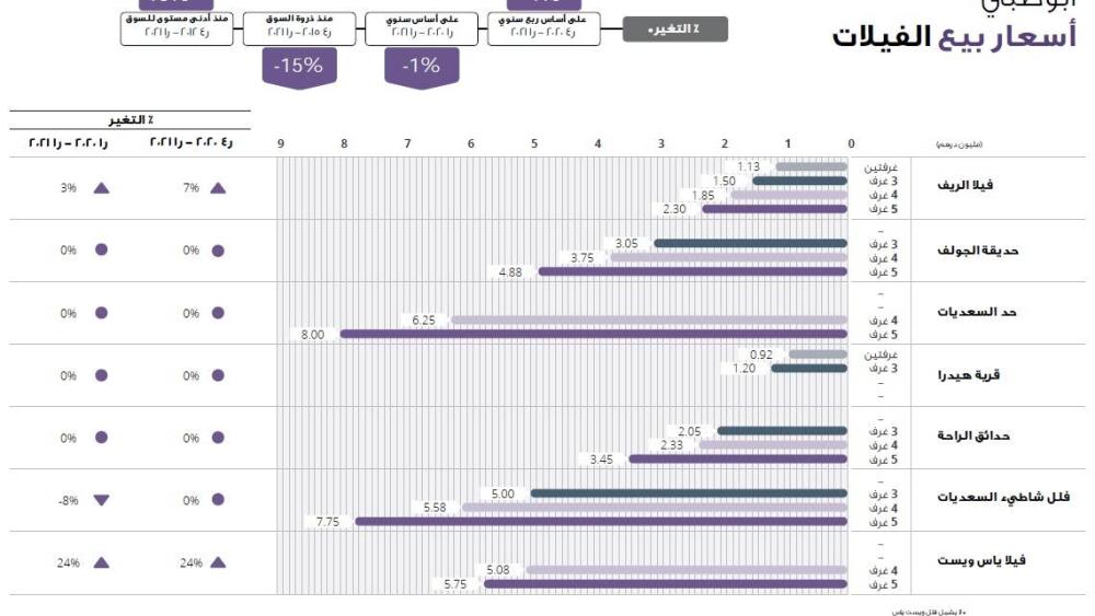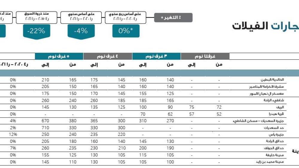 شهد سوق العقارات السكنية في أبوظبي تسليم قرابة 1700 شقة و50 فيلا خلال الربع الأول من عام 2021، وزيادة ملحوظة في مستويات الطلب على الفلل، خاصة في مجمعات الفلل الفاخرة مثل «جزيرة ياس» و«شاطئ الراحة» و«جزيرة السعديات» ومجمع «الريف». وفي حين لم يشهد متوسط أسعار تأجير الفلل تغييراً يذكر خلال الربع المذكور، إلا أن مجمعات «ياس غرب» و«حدائق الجولف» و«فلل شاطئ السعديات» سجلت زيادة ملحوظة في أسعار التأجير خلال تلك الفترة.