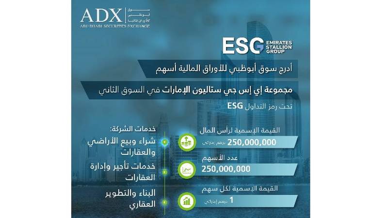 أعلن «سوق أبوظبي للأوراق المالية»عن إدراج أسهم مجموعة «إي إس جي» ستاليونز الإمارات المملوكة للشركة «العالمية القابضة» والمتخصصة بخدمات الاستثمار والهندسة والبناء، في منصة السوق الثاني؛ حيث بدأ التداول على أسهم المجموعة، اعتباراً من الاثنين، تحت الرمز ESG.