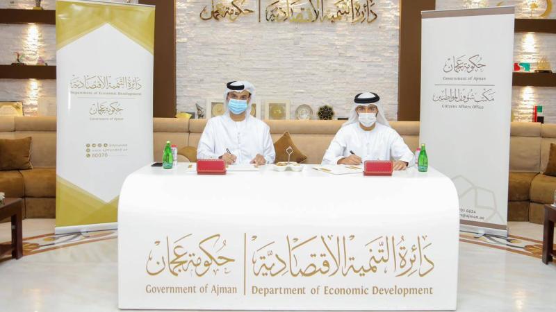 وقع مكتب شؤون المواطنين ودائرة التنمية الاقتصادية في عجمان مذكرة تفاهم بهدف تعزيز التعاون المشترك والاستفادة من الإمكانيات المتاحة لدى الطرفين، وبما ينعكس أثره على توفير سبل الحياة الكريمة للمواطنين كافة، وقع المذكرة الشيخ عبد الله بن ماجد النعيمي، مدير عام المكتب وعبد الله أحمد الحمراني مدير عام الدائرة.
