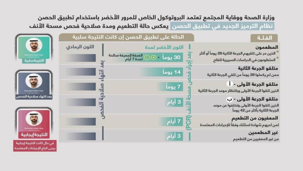 وتم اعتماد البرتوكول الخاص للمرور الأخضر، بهدف تخفيف القيود الناتجة عن جائحة «كورونا»، وتسهيل حركة التنقل والسياحة بأمان في جميع أنحاء الدولة، باستخدام تطبيق «الحصن»، لإظهار حالة التطعيم وصلاحية الفحص.