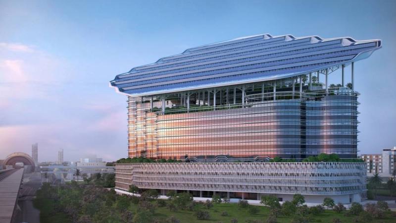 سيتضمن جناح هيئة كهرباء ومياه دبي في إكسبو 2020 دبي نموذجاً للمبنى الرئيسي الجديد للهيئة الذي يحمل اسم «الشراع»، وسيكون أعلى وأكبر وأذكى مبنى حكومي صفري الطاقة في العالم. ويعادل إجمالي الطاقة المستخدمة في المبنى على مدار العام أو يقل عن الطاقة التي ينتجها. وتم تصميم المبنى للحصول على التصنيف البلاتيني الخاص بالمباني الخضراء - الريادة في الطاقة والتصميم البيئي (LEED)، ومعايير نظام (WELL) الفضي العالمي للمباني الخضراء. وسيتصل مبنى هيئة كهرباء ومياه دبي الجديد بشكل مباشر مع مترو دبي؛ وذلك لتشجيع استخدام وسائل النقل العامة وتقليل الازدحام المروري وتخفيض البصمة الكربونية. وسيستخدم المبنى تقنيات إنترنت الأشياء، والبيانات الكبيرة والمفتوحة والذكاء الاصطناعي، وأحدث وسائل إدارة المباني الذكية.