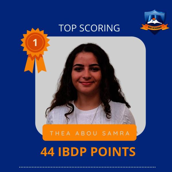 يسعدنا أن نعلن أن 30% من طلابنا قد حققوا 40 درجة وأعلى مقارنة بـ 18 % من الطلاب في جميع أنحاء العالم. يعتبر هذا هو المستوى العالمي للقبول في الجامعات النخبة في العالم، مثل كامبريدج، وأكسفورد وهارفارد وستانفورد. كما نودّ أن نعلن عن الطالبة الحاصلة على أعلى الدرجات في أكاديمية رأس الخيمة هي تيا أبو سمرة، التي سجلت 44 درجة، ما يجعلها ضمن أفضل 5% من الطلاب في جميع أنحاء العالم.