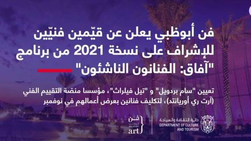 أعلن فن أبوظبي، الأحد، أن القيّمين الفنيَّين سام بردويل وتيل فيلراث، المؤسسين لمنصة التقييم الفني متعددة التخصصات «آرت ري أوريانتد»، سيشرفان على نسخة 2021 من برنامج «آفاق: الفنانون الناشئون». وقد كلف القيّمان الفنيَّان كلاً من الفنانين الناشئين هاشل اللمكي وميثاء عبدالله وكريستوفر بنتون الذين يعيشون في دولة الإمارات لعرض أعمالهم في نسخة هذا العام من المعرض في نوفمبر القادم.