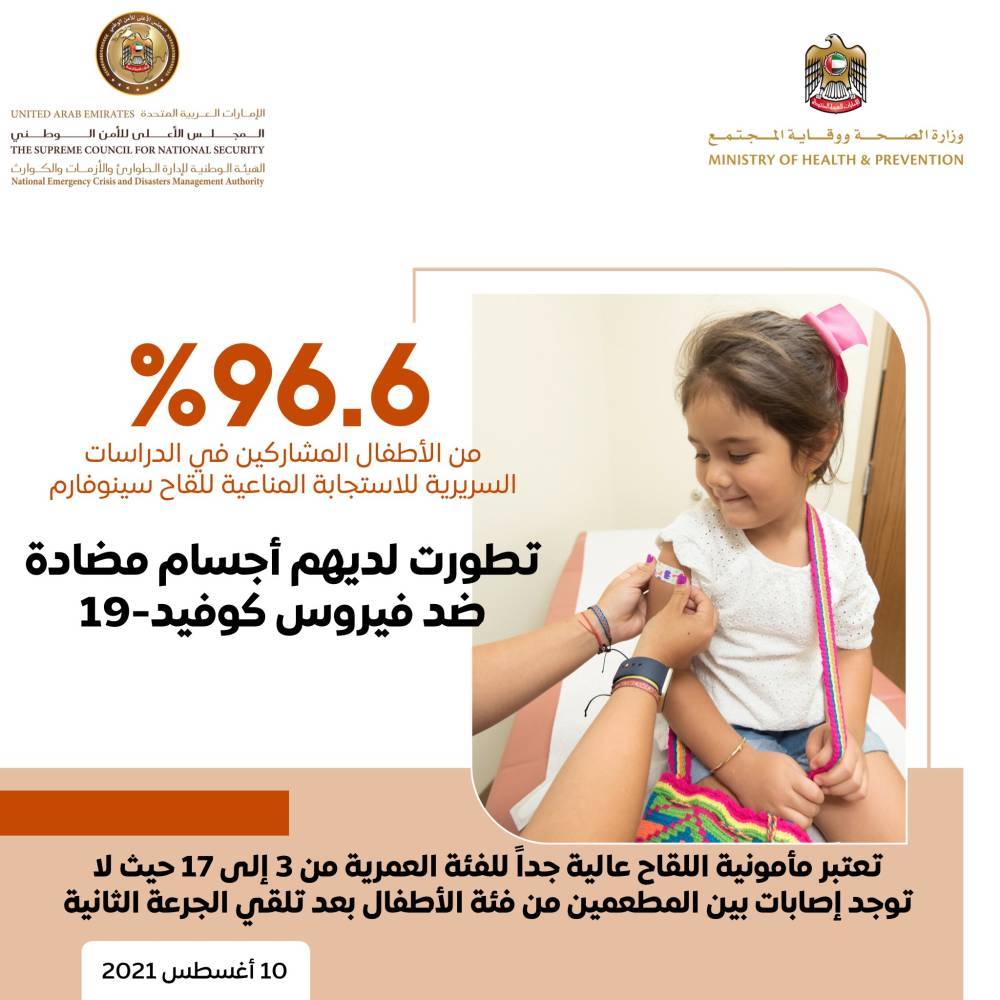وفي إطار جهود الدولة لتوفير الرعاية الصحية المتكاملة لجميع فئات المجتمع من دون استثناء، تم الإعلان مسبقاً عن توفير اللقاح للأطفال من السن 3 إلى 17 من لقاح سينوفارم، بينما لقاح فايزر فهو متوفر للأطفال أيضاً من الفئة العمرية 12 – 15 سنة.