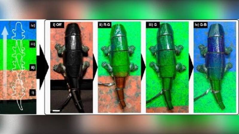 واختبر الباحثون «جلد الحرباء» على الروبوت، وتبين أنه يغير لونه وفقاً للوسط المحيط. وزود الباحثون الروبوت الحرباء بالدوائر الدقيقة اللازمة، التي تمكنه من الزحف إلى الأمام. وأجهزة الاستشعار المثبتة على السطح السفلي من «جسمه» تتعرف إلى اللون الذي يزحف عليه الروبوت، وعلى ضوء ذلك يتغير لونه.