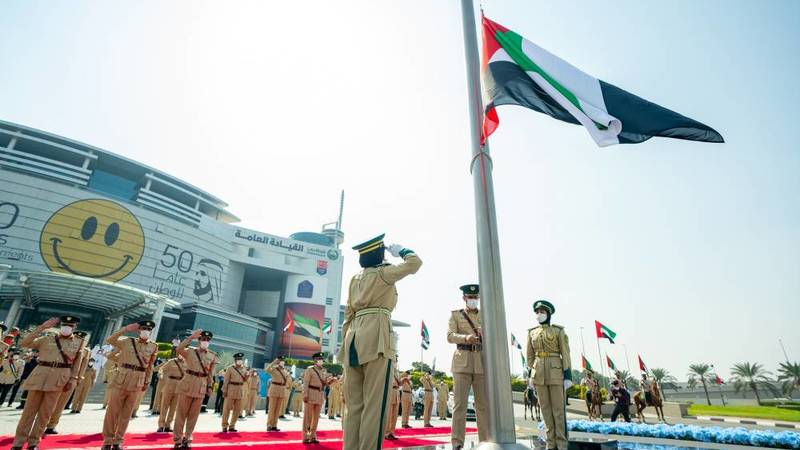 وبدأت احتفالية يوم العلم بتقدم القائد العام لشرطة دبي إلى السارية ورفع العلم، تزامناً مع أداء جميع المشاركين من الضباط تحية العلم، ثم عزفت فرقة شرطة دبي الموسيقية السلام الوطني لدولة الإمارات.
