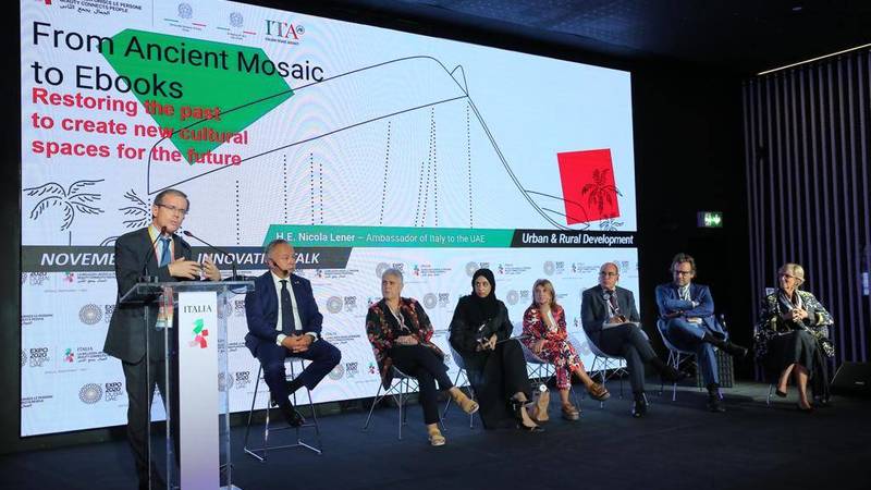كما عُقدت محاضرة بعنوان «من الفسيفساء العتيقة إلى الكتب الإلكترونية: استعادة ذكريات الماضي لخلق مساحات ثقافية جديدة للمستقبل» في يوم الخميس الموافق 4 نوفمبر في مدرج الجناح الإيطالي بمعرض إكسبو 2020 دبي وكانت هذه المحاضرة هي الرابعة ضمن سلسلة جلسات حوار الابتكار التي ستعقد حتى مارس 2022 والتي ستطرح التحديات العالمية الحالية والكشف عن الحلول المبتكرة. يأتي ذلك بالتزامن مع معرض الشارقة الدولي للكتاب (SIBF) في دورته الأربعين، إلى جانب استكشاف آلية تمكن معارض الكتاب الإيطالية والإماراتية من ضم مجموعة واسعة من الناشرين والمؤلفين والأسماء البارزة.