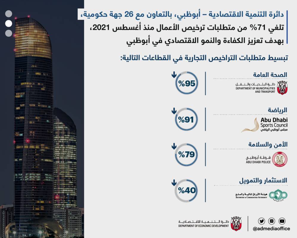 وضمن قائمة الجهات الحكومية ال26 المشاركة في جهود خفض متطلبات ترخيص الأعمال التي تقودها دائرة التنمية الاقتصادية- أبوظبي، كانت نسب خفض المتطلبات على الشكل التالي: دائرة البلديات والنقل (DMT) – قطاع الصحة العامة بنسبة 95٪، من 9,654 إلى 511 متطلباً تغطي 1,215 نشاطاً، وقطاع النقل بنسبة 78٪ من 523 إلى 115؛ وهيئة أبوظبي للزراعة والسلامة الغذائية ( ADAFSA) بنسبة 74٪، من 6,587 إلى 1,716متطلباً تغطي 288 نشاطاً؛ ومجلس أبوظبي الرياضي بنسبة 91٪، من 949 إلى 82 متطلباً يغطي 58 نشاطاً؛ ودائرة الصحة بنسبة 56٪ من 1,512 إلى 672 متطلباً تغطي 84 نشاطاً؛ وشرطة أبوظبي بنسبة 79٪ من 387 إلى 80 متطلباً؛ وهيئة الأوراق المالية والسلع بنسبة 40٪ من 1,160 إلى 700 متطلب.