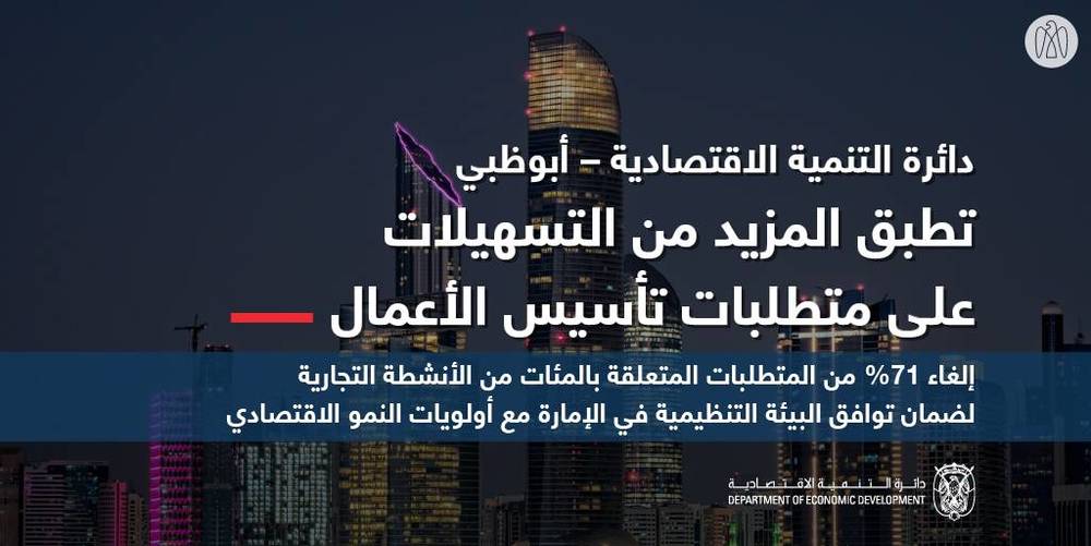 أعلنت دائرة التنمية الاقتصادية- أبوظبي إلغاء ما يزيد على 20 ألفاً من متطلبات ترخيص الأعمال في أبوظبي ضمن مبادرة شاملة ومستمرّة لمراجعة اللوائح التنظيميّة للأعمال في الإمارة، التي تقوم بإدارتها «اقتصادية أبوظبي» والتي ارتفع عدد الدوائر والجهات الحكوميّة المشاركة فيها منذ إعلانها للمرّة الأولى في أغسطس الماضي إلى 26 جهّة محليّة واتحاديّة. وطال الإلغاء، الذي يهدف إلى دعم الاستثمار في الإمارة، 71% من كل متطلبات ترخيص الأعمال التي بلغ عددها سابقاً 28,788.