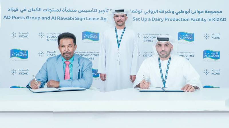 أعلنت كيزاد العاملة تحت مظلة قطاع المدن الاقتصادية والمناطق الحرة التابع لمجموعة موانئ أبوظبي، عن توقيع اتفاقية تأجير مع شركة الروابي، لتأسيس منشأة لمنتجات الألبان في أبوظبي بتكلفة تقدر بنحو 650 مليون درهم، وتهدف إلى تلبية الطلب الاستهلاكي المتنامي على هذا النوع من المواد الغذائية، وتعزيز قدرات شركة الروابي على التصدير إلى منطقة دول مجلس التعاون الخليجي.
