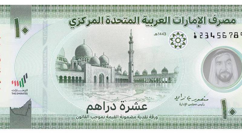 حافظت الورقة النقدية الجديدة من فئة العشرة دراهم على لونها الأخضر، ليكون مماثلاً للون الورقة النقدية الورقية المتداولة حالياً. وتظهر في وسط الوجه الأمامي صورة مسجد الشيخ زايد الكبير الذي يُعد مَعلماً دينياً، وطنياً، وثقافياً بارزاً في الدولة، ويحظى بمكانة متميزة على مستوى العالم،. كما تظهر في وسط الوجه الخلفي للورقة النقدية صورة «مدرج خورفكان» كأحد المعالم الثقافية البارزة في إمارة الشارقة.