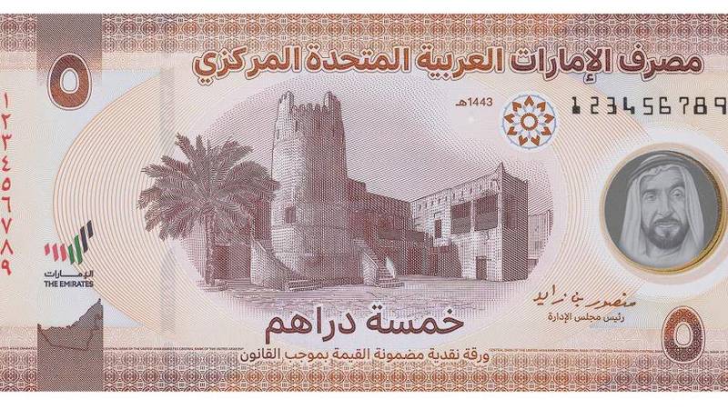 حرص المصرف المركزي في تصميم الورقة النقدية الجديدة من فئة الخمسة دراهم على المحافظة على الخصائص الفنية اللونية في الورقة النقدية الورقية المتداولة حالياً من الفئة ذاتها، لتسهيل التعرف إليها من قبل الجمهور. كما تم إدخال صور عدد من الرموز الوطنية والحضارية في دولة الإمارات في التصميم، حيث تظهر في وسط الوجه الأمامي لهذه الورقة النقدية صورة «قلعة عجمان» كمعلم أثري وتاريخي يقف شاهداً على الإرث الحضاري والتاريخي للآباء والأجداد. كما تظهر في وسط الوجه الخلفي للورقة النقدية صورة «قلعة ضاية» في إمارة رأس الخيمة التي تُعد وجهة ثقافية وتراثية مميزة في الدولة.