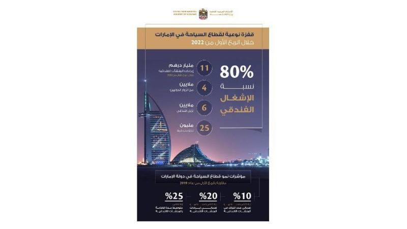وفقاً للبيانات السياحية عن الربع الأول من العام الجاري 2022، فقد استقطبت المنشآت الفندقية في الدولة نحو 6 ملايين زائر قضوا 25 مليون ليلة فندقية، بنمو 10% مقارنة بالفترة ذاتها من عام 2019. وحقق متوسط مدة إقامة نزلاء المنشآت الفندقية نمواً بنسبة 25% خلال فترة المقارنة نفسها، مرتفعاً من 3 ليالٍ إلى 4 ليالٍ فندقية. وبلغت نسبة إشغال المنشآت الفندقية بالدولة خلال هذه الفترة 80% والتي تعد من النسب الأعلى عالمياً. كما حققت المنشآت الفندقية إيرادات بقيمة 11 مليار درهم، بنسبة نمو 20% مقارنة بنفس الفترة من عام 2019، وسجلت هذه المنشآت العودة إلى العمل بكامل طاقتها الاستيعابية بنحو 200 ألف غرفة فندقية.