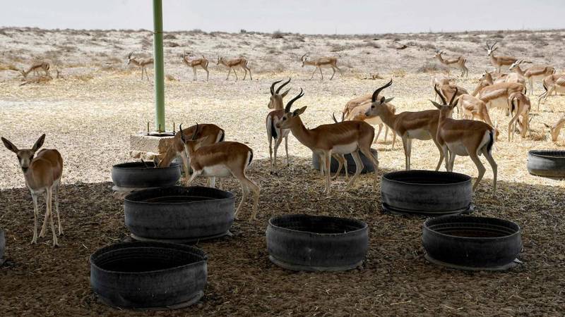 وسط الصحراء، في المحمية، تبعثر ما بقي من هذه الغزلان البنية ذات القرون الرفيعة والوبر الصغير، وسط أرض جرداء تخلو من الخضراوات، فيما قام البيطري بخلط المياه بدواء للحيوانات التي احتمت في الظلّ.