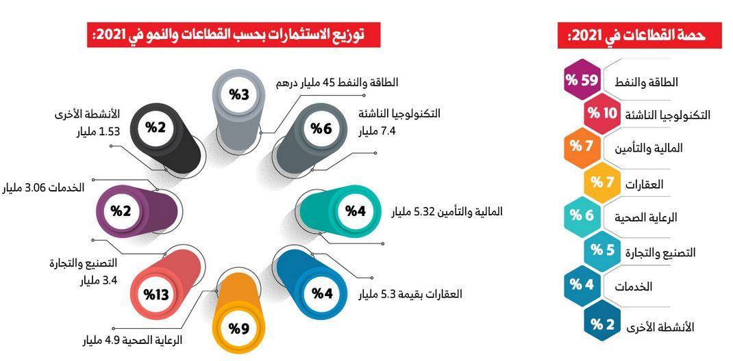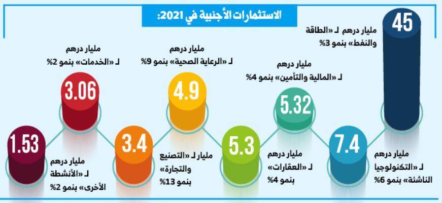 حققت كافة القطاعات الاقتصادية في دولة الإمارات؛ نمواً إيجابياً في جذبها لاستثمارات أجنبية مباشرة خلال العام الماضي 2021 وبنسب متفاوتة؛ حيث تراوحت بين 2% لقطاع الخدمات، 13% في قطاع التصنيع، 9% في قطاع الرعاية الصحية، 6% لقطاعات التكنولوجيا الناشئة، 4% المالية والتأمين، التطوير العقاري 4%، النفط والغاز والطاقة 3%، وأخرى 2%.