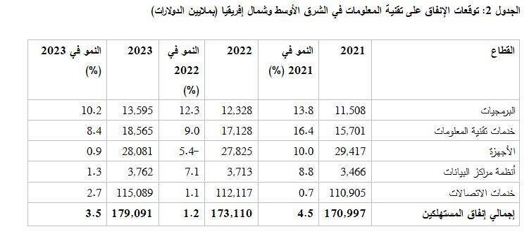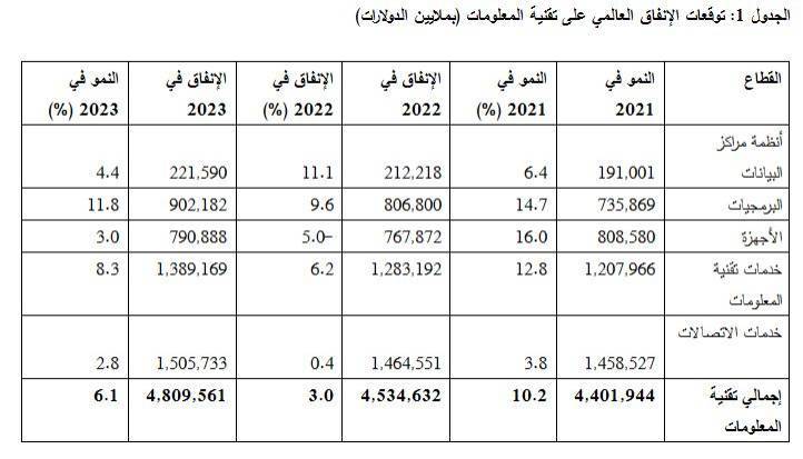 من المتوقع أن يصل إجمالي الإنفاق على تقنية المعلومات في العالم إلى 4.5 تريليون دولار في العام 2022، بزيادة قدرها ثلاثة في المئة عن العام 2021، وفقًا لأحدث التقارير الصادرة عن شركة أبحاث الأسواق العالمية «غارتنر». وتشير التوقعات إلى أن النمو في الإنفاق على تقنية المعلومات في العام الجاري سيحدث بوتيرة أبطأ بكثير مقارنة بالعام الماضي، وذلك بسبب الانخفاض المتوقع في إنفاق المستهلكين على أجهزة الحاسوب الشخصية والأجهزة اللوحية والطابعات، والذي سيؤدي إلى تقليص الإنفاق على الأجهزة بنسبة خمسة في المئة. هذا، ومن المتوقع، إقليميًا، أن يصل الإنفاق على تقنية المعلومات في منطقة الشرق الأوسط وشمال إفريقيا العام الجاري إلى أكثر من 170 مليار دولار.
