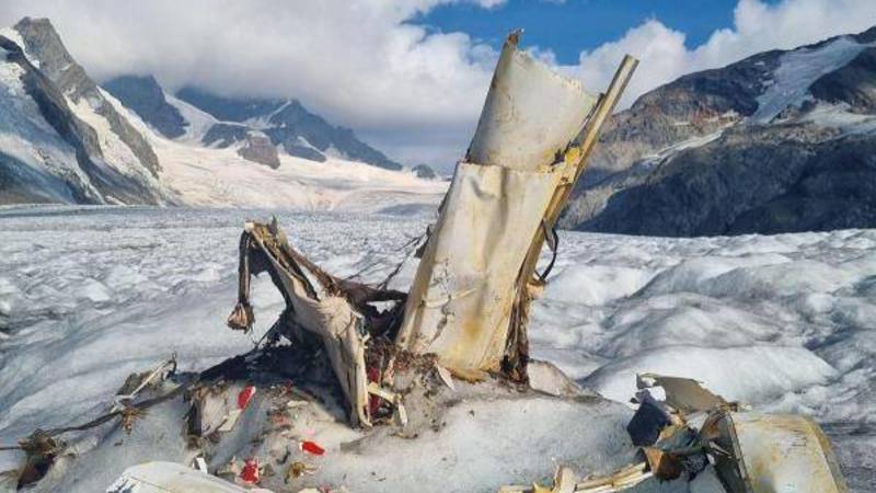 ورُصدت بقايا الطائرة على نهر أليتش الجليدي جنوب غربي كانتون فاليه قرب قمتي يونغفراو ومونك.