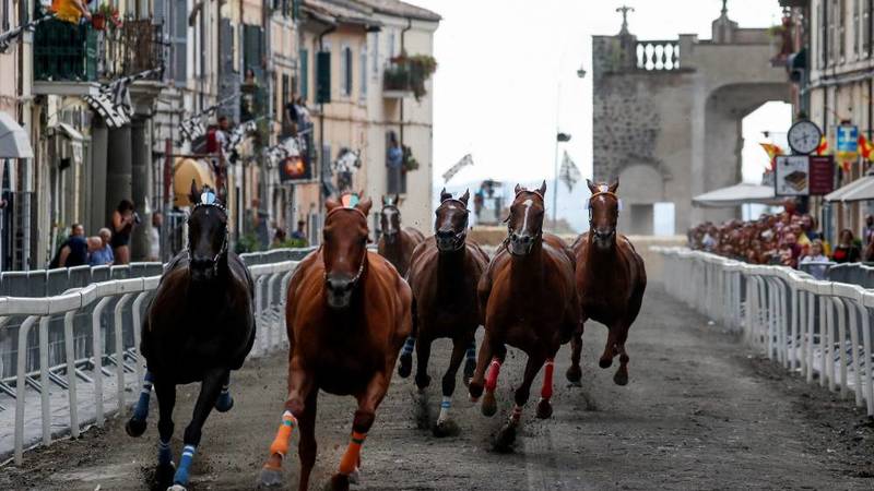 تشهد شوارع مدينة رونكيليوني الإيطالية القديمة سنوياً سباق خيول تقليدياً من دون فرسان يطلق عليه اسم «باليو دي سان بارتولوميو».