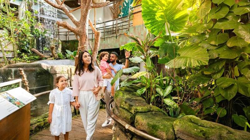 في حين تدعو القبة البيئية ذا جرين بلانيت زوارها لاستكشاف أجواء الغابات الاستوائية؛ إذ تحتضن أكثر من 3 آلاف نوع من النباتات والحيوانات والطيور. ويقضي الضيوف من جميع الأعمار لحظات مذهلة عند مشاهدة حيوانات الكسلان أو الليمور التي تتنقل بحرية بين الأشجار. وتأخذ المحمية الخضراء الصغار في رحلة إلى البرية الأسترالية، وقد يتسنى لهم فرصة رؤية حيوانات الوالبي أو ثعابين السجاد. وتتنوع التجارب الاستثنائية في ذا جرين بلانيت بين مغامرة التخييم الليلية في الغابة المطيرة، والغطس بين أسماك البيرانا، وتسلم مهام حارس الحديقة ليوم واحد.