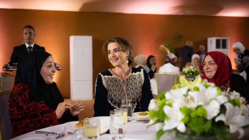 وظهرت رانيا العبدالله بعفوية معتادة وهي تتواصل مع الحاضرات، واستجابت سريعاً لطلب مصافحة بعضهن دون تكلّف.