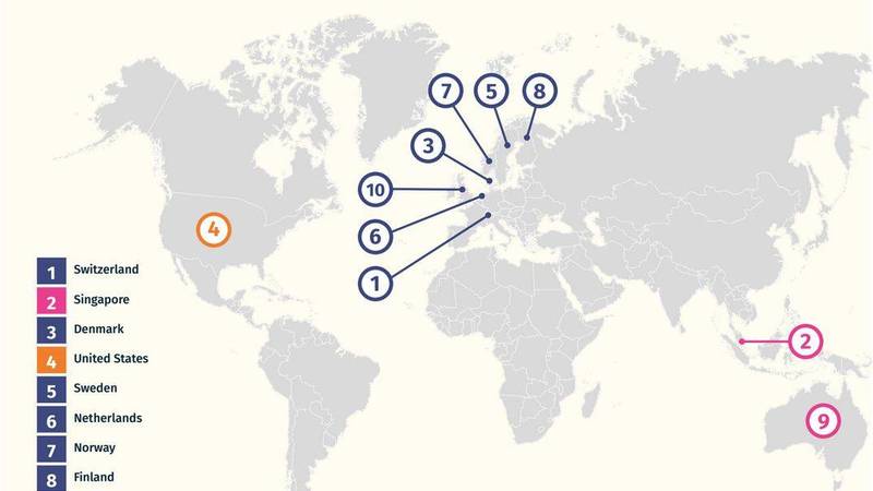 وجاءت الولايات المتحدة الأمريكية في المرتبة الـ 45، فيما واصلت العديد من الدول الأوروبية الهيمنة على القائمة، إذ احتلت السويد المرتبة الخامسة تلتها هولندا في المرتبة السادسة والنرويج في المرتبة السابعة، فيما جاءت فنلندا ثامناً والمملكة المتحدة عاشراً. أما فرنسا فجاءت في المرتبة 19 لتحافظ بذلك على مركزها في مؤشر العام الماضي وهو أعلى تصنيف لها.