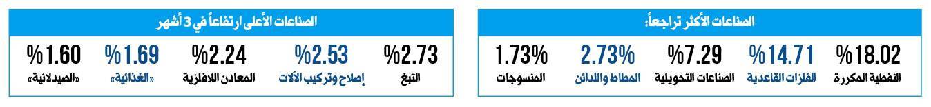 الصناعات التحويلية الأخرى التي تراجعت أسعارها 7.29%، بعد أن ارتفعت 3.98% في الربع الأول، واستقرت في الربع الثاني ( 1.63% وزنها الإجمالي)، منتجات المطاط واللدائن التي تراجعت 2.73%، بعد ارتفاعها 7.33% في الربع الثاني، و 3.92% للربع الأول ( 3.92% الوزن). ثم صناعات المنسوجات بتراجع 1.73%، بعد أن سجلت ارتفاعاً في الربع الثاني 1.07%، ونحو 4.39% في الربع الأول ( 0.27% الوزن).