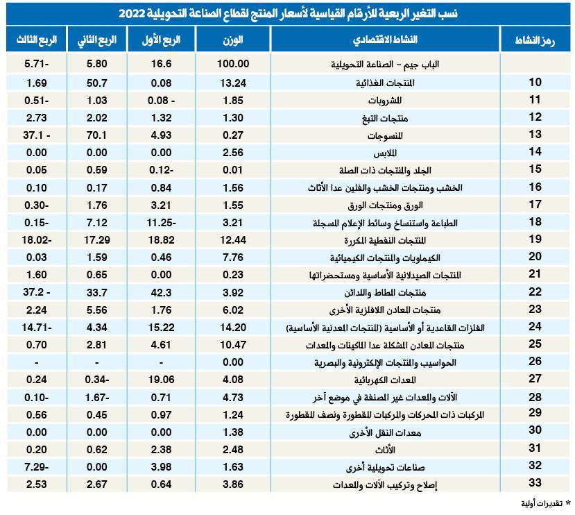 في الجهة المقابلة، ارتفعت أسعار 12 منتجاً صناعياً خلال الفترة المذكورة ( الربع الثالث من 2022) على أساس ربعي.