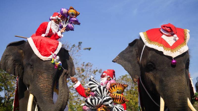 ارتدى راكبو الأفيال زي بابا نويل، وقادوا الحيوانات العملاقة إلى مدرسة في وسط تايلاند، لتوزيع هدايا عيد الميلاد على نحو 2000 طالب هذا الأسبوع، وهو جزء من تقليد سنوي متبع في البلاد. واصطف الطلاب في فناء المدرسة، بينما اقتربت الأفيال ببطء ورفعت خرطومها لتوزيع بالونات وألعاب ودمى.