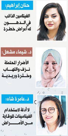 وأضافت: إذا كان الفيتامين ذائباً في الماء، يأخذ الجسم حاجته لدرجة معينة، والباقي يتم طرحه في البول خلال ساعتين، أما إذا كان ذائباً في الدهون فله درجة سمّية معيّنة وأعراض جانبية خطرة، يمكن أن تؤدي إلى السرطان والوفاة، مثل فيتامين A، زيادة الجرعة منه، يمكن أن تؤدي إلى الصداع، ومن ثم الدوار وحتى الوفاة، لذلك فهي ممارسة خطرة جداً بدون إشراف طبيب وبعد تحاليل مخبرية تبيّن النقص والجرعة المطلوبة.