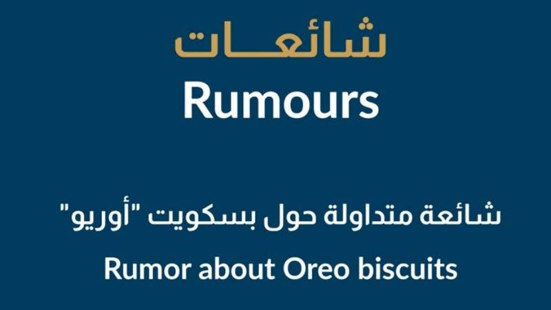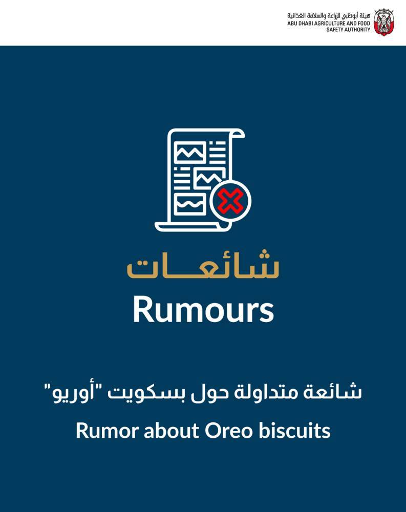 أكدت هيئة أبوظبي للزراعة والسلامة الغذائية، أن الشائعات المتداولة أخيراً عبر مواقع التواصل، بشأن احتواء بسكويت «أوريو» الذي يحمل العلامة التجارية «Oreo» وتنتجه شركة «موندليز الدولية» على نسبة من كحول الإيثانول (Ethanol) وبعض من مشتقات شحم الخنزير، بما يجعله منتجاً غير حلال، هي شائعات لا أساس لها من الصحة، ولا أدلة على ثبوتها.