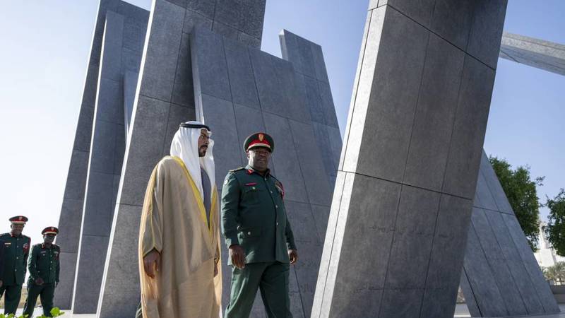 واستعرض عثمان، مع الشيخ خليفة بن طحنون،  مراسم حرس الشرف الذي اصطف لتحيتهما، ثم وضع إكليلاً من الزهور أمام نصب الشهيد الذي يتكون من 31 لوحاً، يستند كل منها إلى الآخر، رمزاً للوحدة والتكاتف والتضامن بين قيادة دولة الإمارات وشعبها وجنودها الأبطال.