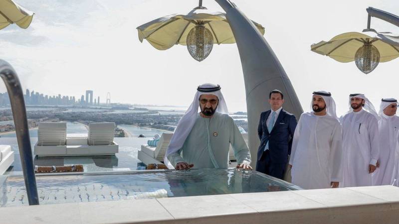 وقال سموه عبر «تويتر» أمس: «خلال زيارة «أتلانتس ذا رويال» في جزيرة النخلة.. تحفة معمارية جديدة نضيفها لقطاعنا السياحي، 6 أبراج يربط بينها جسر مرتفع على مساحة 4 ملايين قدم مربعة، بواجهات بحرية وحدائق معلّقة، وارتفاع 178 متراً. فخورون بإنجازاتنا، مستمرون في تطوير اقتصادنا، مرحبون بطريقة استثنائية بزوارنا».