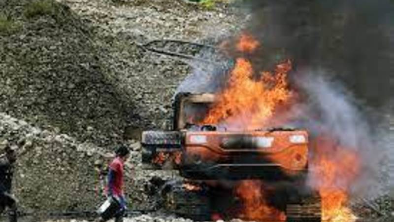 وسط الغطاء النباتي في هذه المنطقة الحدودية مع الإكوادور، وقرب حفر حفرها عمال المناجم، دُمّرت 8 آلات بناء باستخدام متفجرات أو قنابل يدوية.