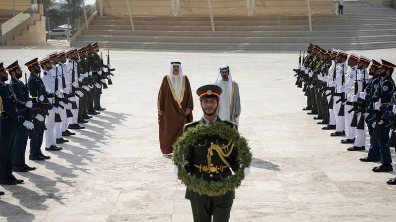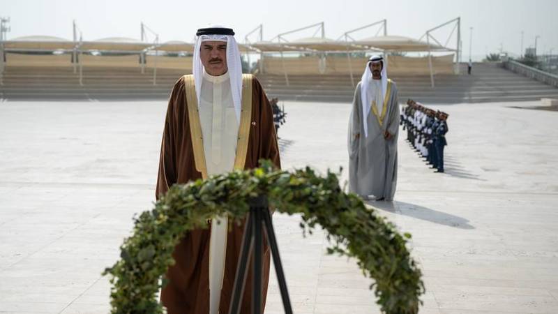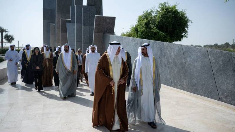 ولدى وصوه إلى واحة الكرامة، استعرض مع الشيخ خليفة بن طحنون، مراسم حرس الشرف ثم وضع إكليلاً أمام نصب الشهيد الذي يتكون من 31 لوحاً يستند كل منها إلى الآخر، رمزاً للوحدة والتكاتف والتضامن بين قيادة دولة الإمارات وشعبها وجنودها الأبطال.