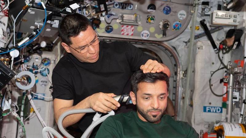 نشر مركز محمد بن راشد للفضاء صورة لرائد الفضاء الإماراتي سلطان النيادي، على متن محطة الفضاء الدولية، وهو يقوم بأول تسريحة شعر.