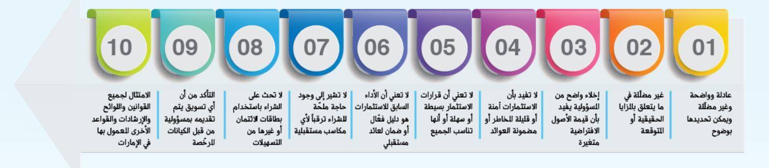9. التأكد من أن أي تسويق يتم تقديمه بمسؤولية من قبل الكيانات المرخّصة، وأن يهدف إلى تقديم المنتجات أو الخدمات المناسبة فقط للجمهور، بما في ذلك، على سبيل المثال لا الحصر، المعايير المحددة بشأن تأهيل المستثمرين وتسجيل حضورهم للفعالية.